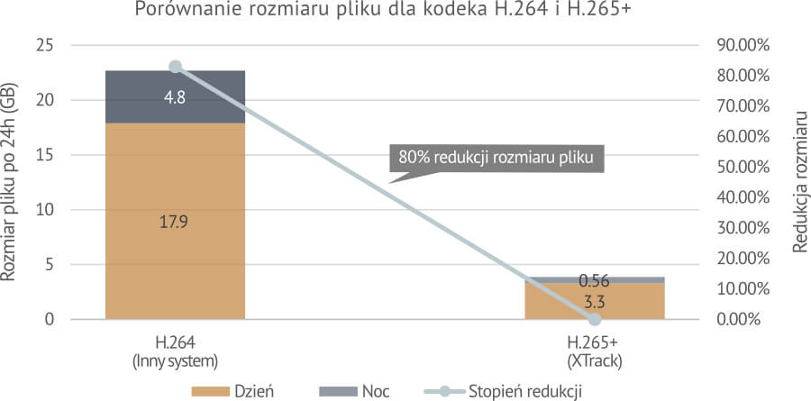 Rozwiązanie? Zintegrowany system rejestracji obrazu XTrack, stosujący jako podstawowy, kodek H.265+. Technologia ta pozwala zredukować wielkość plików z nagraniami wideo, zależnie od rejestrowanej sytuacji, nawet o 80%.